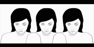 face-à-face de deux séries de trois (l'une en-face du miroir,